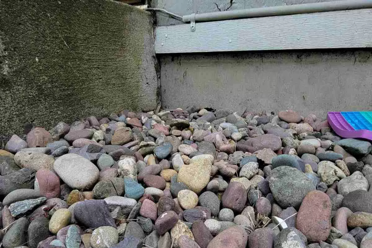 The image above depicts an outside scene with many stones that have been set, and based on the situation, it can be assumed that it has just rained, and thus there is some wetness everywhere around.