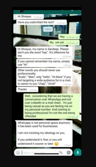 Shreyas stood up for himself and said, “Well, considering that we are having a conversation over WhatsApp and not over LinkedIn or a mail chain. I’m just being casual as you are texting me on my personal number. And coming to being professional, I’m not the one being offended.”