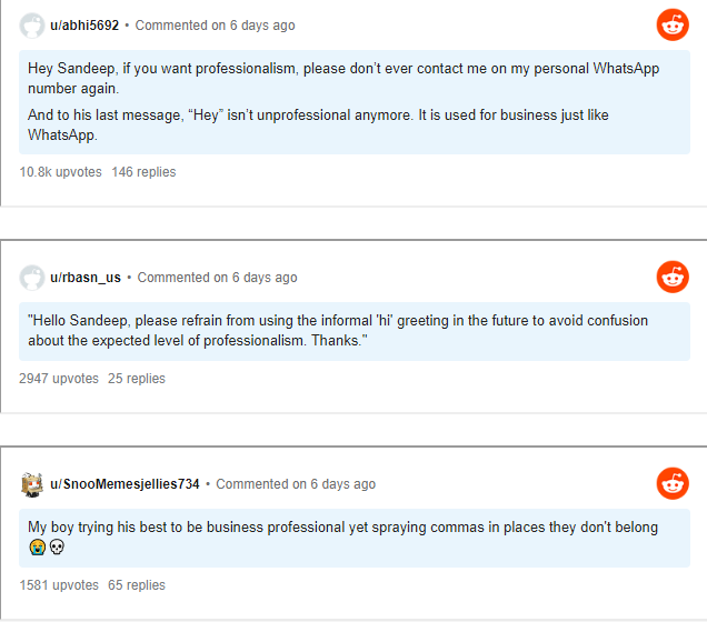 The screenshot on Reddit shows that the user, whose name is Shreyas, replied to his boss’s Whatsapp message with the word “hey,” which didn’t go over too well with him. He answered Shreyas’s text by calling it “offensive.”