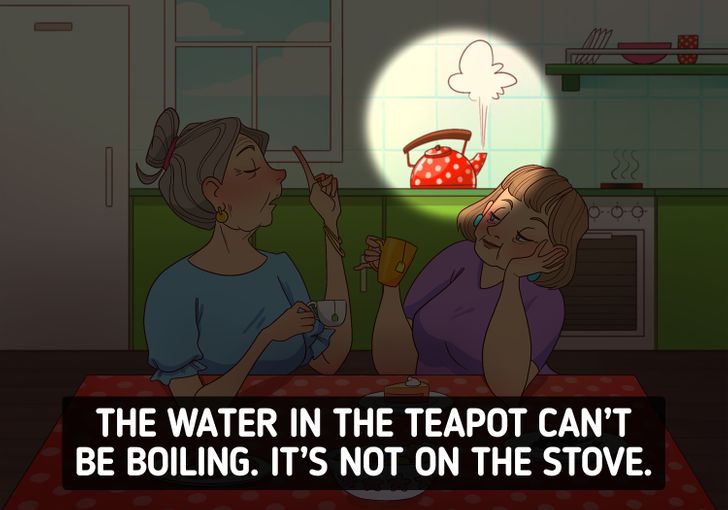The error is concealed in the kitchen area behind the women. The stove does not have a kettle. But even without heat, the water in the teapot is boiling. It must be placed on the stove to boil.