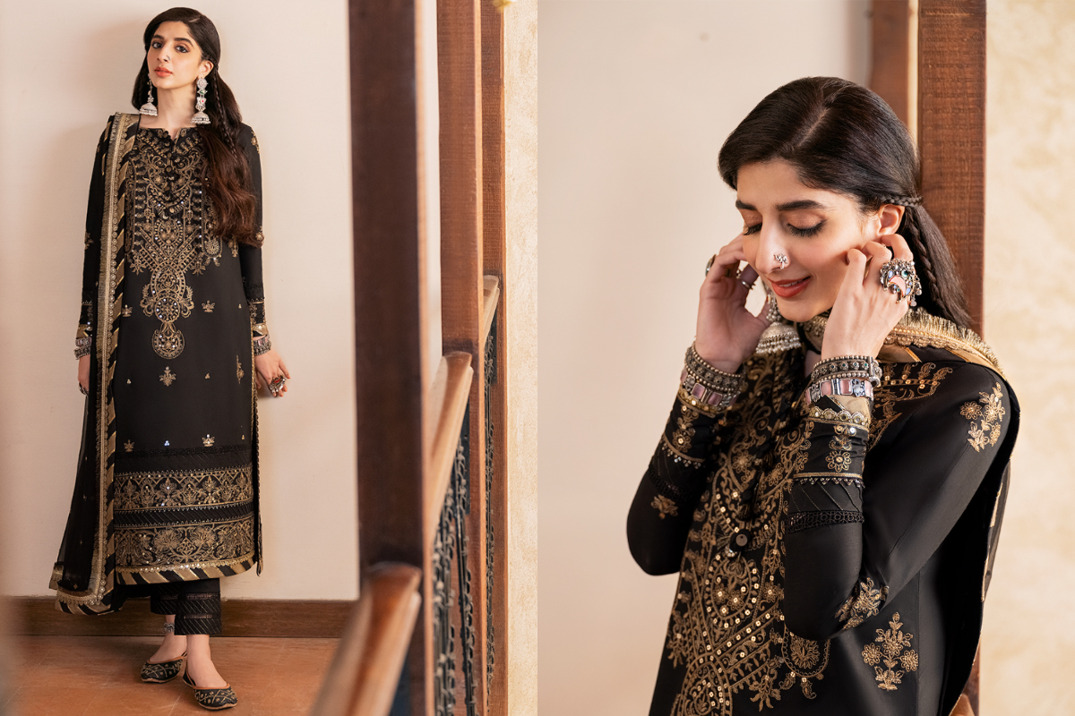 The renowned Pakistani actress and model Syra Yousuf is depicted in the collection’s first image. With her regal demeanour and enduring allure, Yousuf appears to have stepped out of the time of the Lukhnawi Nawabs. She is dressed in an airy outfit made of raw chanderi lawn embellished with chikankari embroidery and matte gold 5mm sequins, giving it an authentic look.