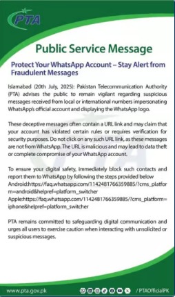 PTA issued this advisory on WhatsApp scam messages as part of its ongoing efforts to enhance digital safety. The authority urges users to stay vigilant when handling unsolicited or suspicious messages to avoid becoming victims of online fraud.