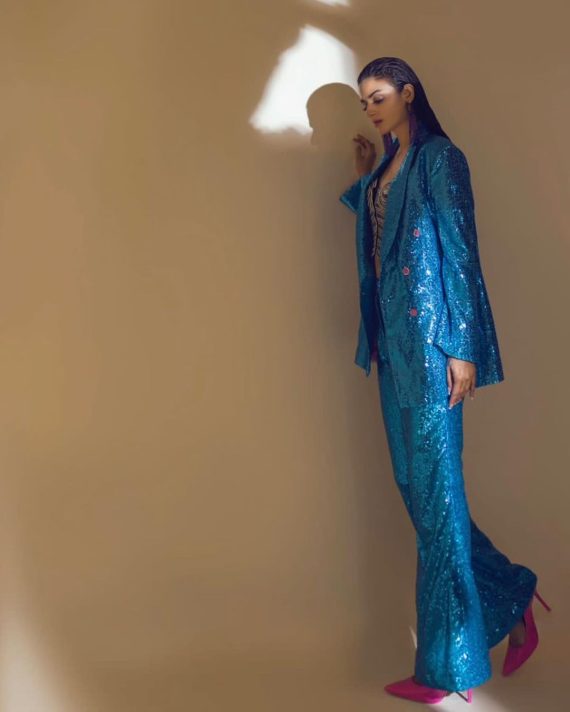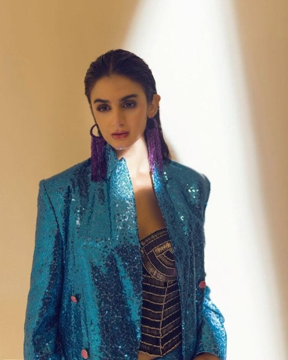 Hira Mani wore a sparkly sequined mermaid blue suit paired with big purple earrings for a recent shoot. She posed in an interesting manner and shared the pictures with her fans on Instagram.