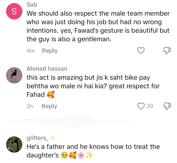 During the show, Fahad Mustafa invited a cute girl from the audience who won a bike. When his team stepped in to help her sit on it, a male team member approached, but Fahad immediately stopped him and asked a female team member to assist the girl instead.