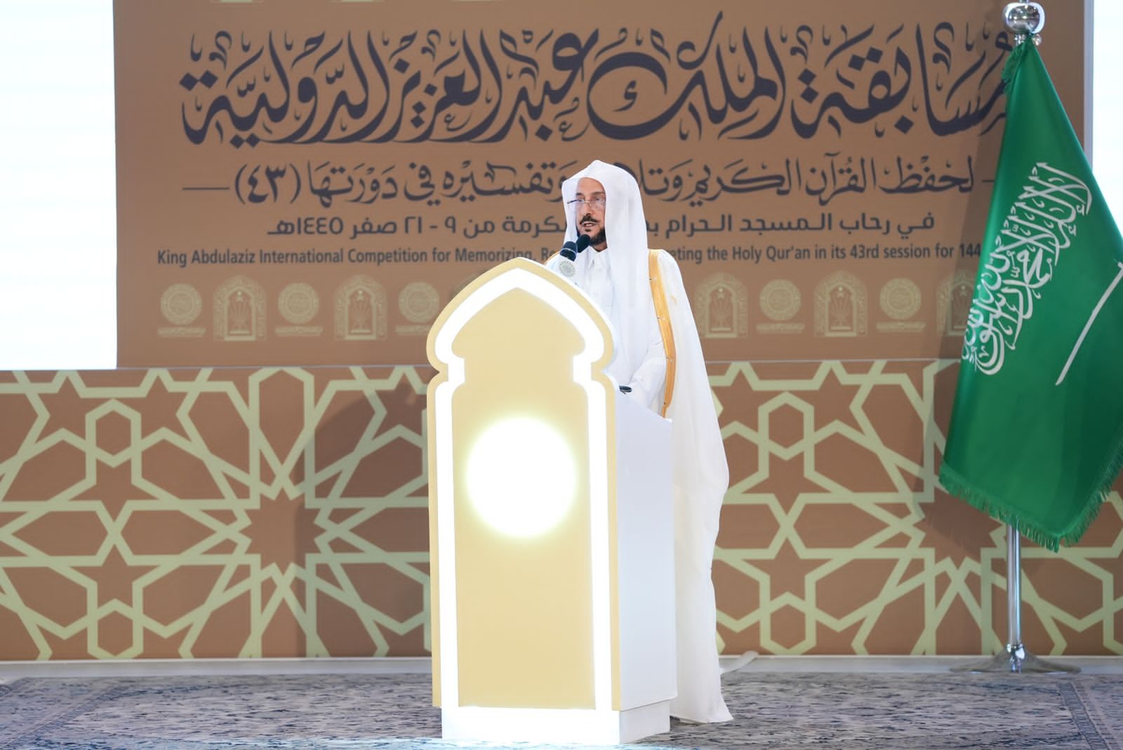 He said, “I am pleased to welcome you to this blessed night, beside the Kaaba, in the premises of the Grand Mosque, for the closing ceremony of the King Abdulaziz International Quran Memorization, Recitation, and Interpretation Competition in its 43rd edition, under the patronage of our master, the Custodian of the Two Holy Mosques, King Salman bin Abdulaziz Al Saud, may Allah protect him.”